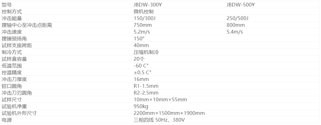 试验机类型:微机屏显低温全自动冲击试验机 规格型号:JBDW-Y系列 冲击能量:300J/500J 一、性能说明: JBDW-Y系列低温全自动冲击试验机,用来对金属材料在动负荷下抵抗冲击的性能进行检验,是冶金机械制造等单位必备的检测仪器,也是科研单位进行新材料研究不可缺少的测试仪器。 1、本机采用全自动控制,扬摆、挂摆、送料、定位、冲击及温度调节设备均为电气、机械控制,配备专用送料装置自动送料,试样自动端面定位。试样出低温箱至冲击时间不大于2秒,满足金属低温夏比冲击试验方法的要求。在冲击试样后可利用剩余能量自动扬摆,做好下次试验准备,工作效率高; 2试验机主体为分体式结构,悬臂式挂摆方式,摆锤锤体C型; 3、冲击刀采用螺钉安装固定,更换简单方便; 4、试样简支梁式支承; 5、主机装有安全防护网; 6、试验机符合国标GB/T3808-2002《摆锤式冲击试验机的检验》,按国标GB/T229-2007《金属材料 夏比摆锤冲击试验方法》对金属材料进行冲击试验。 二、主机结构及工作原理: 1、低温冲击机试验机由主机、低温装置、送料机构及自动定位机构组成。 2、低温装置:该低温装置是我公司根据GB/T229-2007《金属材料 夏比摆锤冲击试验方法》中对低温装置的要求而最新研制开发的压缩机制冷设备。采用复叠式压缩机制冷技术,利用热平衡原理及循环搅拌方式,达到对试样的自动均匀冷却、恒温,可完全满足国家标准所规定的各项控温指标。低温槽采用单片微机技术控制,数显温度值,自动控温、自动记时、自动报警,操作简便安全,制冷速度快,容积大,控温精度高,是金属材料低温冲击试验中理想的试样冷却、保温设备。 3、送料机构:试样在低温装置里冷却到所设定温度后,送料机构可迅速可靠地将试样送到钳口支承面上。送料机构主要有送料装置、阻尼装置两部分组成。送料机构的运动是由电机通过大小皮带轮、磨擦片、齿轮轴传至齿条、送料杆将电机的正反转,转换成送料杆迅速向前送料及向后复位的直线运动。送料齿轮前后装有拨叉,齿条运动时,拨叉撞动阻尼油缸的活塞杆借助于油缸的阻尼作用,使齿条前进和齿轮转动受到阻力,借助于摩擦轮摩擦打滑,降低送料速度,从而保证试样可靠地送入钳口面及送料杆正确的回到原位。摩擦片打滑,能保护元器件不受损坏,调节螺母前后位置,弹簧压力随之变化,使摩擦力的大小随之变化,可改变送料杆推力的大小,调节阻尼油缸中的节流阀,改变排油量,改变阻尼力的大小,随之改变了送料至前后端的速度,阻尼油缸中采用46号液压油(或其它粘度相同的机油),油的加注量不宜过少。送料杆前进、反向、停止等是送料杆的遮挡片遮挡接近开关发出电气信号,控制电机的转向实现的。调节开关遮挡片的位置,可以微调送料杆的位置及行程长度。 4、定位机构:试样必须紧贴钳口侧面,使试样缺口正确地位于摆锤轴线中心。试样紧贴钳口侧面,是由定位机构保证的。试样由送料杆送至前支座时,由于固定弹簧片的作用,使试样紧贴钳口侧面往前运动,当试样后端还没有脱离固定弹簧片,前端进入后钳口面时,送料机构中的遮挡片遮挡接近开关发出信号,电磁铁动作,随即定位机构动作,定位机构的定位杆到工作位置,定位机构侧面弹性顶柱紧压试样,直至试样前端紧贴定位机构定位面,完成试样定位工作。当送料杆弹簧压缩时,电磁铁再获信号后复位,定位机构远离试样定位面,以便进行冲击。定位机构与支架装成一体,电磁铁的拉动和弹簧的复位带动定位块上下移动,推动定位螺钉在弹簧的作用下,定位螺钉始终紧贴定位面,同时通过活动套筒上的销子,定位机构带动侧面的弹性顶柱转动。偏心块能减少定位机构对试样的惯性冲击,因此能提高试样定位的准确性。 三、主要技术指标: