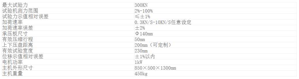 试验机类型:全自动压力试验机 规格型号:YAW-300B 试验力:300KN 一、产品概述: YAW-300B型微机控制全自动压力试验机按照GB177-85和GB17671-1999《水泥胶砂抗压强度试验方法》自动完成一批六次试验恒应力加载自动计算平均值,判断试验数据的有效性。该产品具有精度高、性能优越、可靠性高、操作方便等特点。本机完全符合GB/T3722-92、GB/T2611-92标准。可为您提供准确的实验结果。主要用于水泥胶砂、混泥土试块抗压强度试验,亦可用于橡胶垫、瓦砖、金属制品、构件以及其它材料的抗压试验,使科研院所,水泥质检、工矿企业、水泥、胶砂等部门的理想测试设备。 二、功能特点: 1. 无压力油泄漏和比例阀堵塞等不良现象、噪音低、可靠性高; 2. 中文windows控制及处理软件、采用人性化设计,界面美观、操作简便。可任意设定保压值,保压时间,自动计算试验结果; 3. 先进的自动控制功能,可对试件进行单件或批量试验; 4. 具有等速应力、试验力保持等控制模式、实现试验参数的设定、数据的采集、分析、存储及打印; 5. 可根据国家标准或用户要求配置相应的控制件; 6. 试样破坏后,移动横梁自动停止移动(或自动返回初始位置); 7. 具有程控和机械两级限位保护; 8. 当负荷超过额定值3~5%时,自动停机。 三、主要技术参数